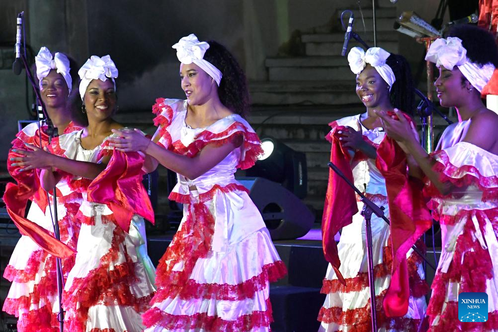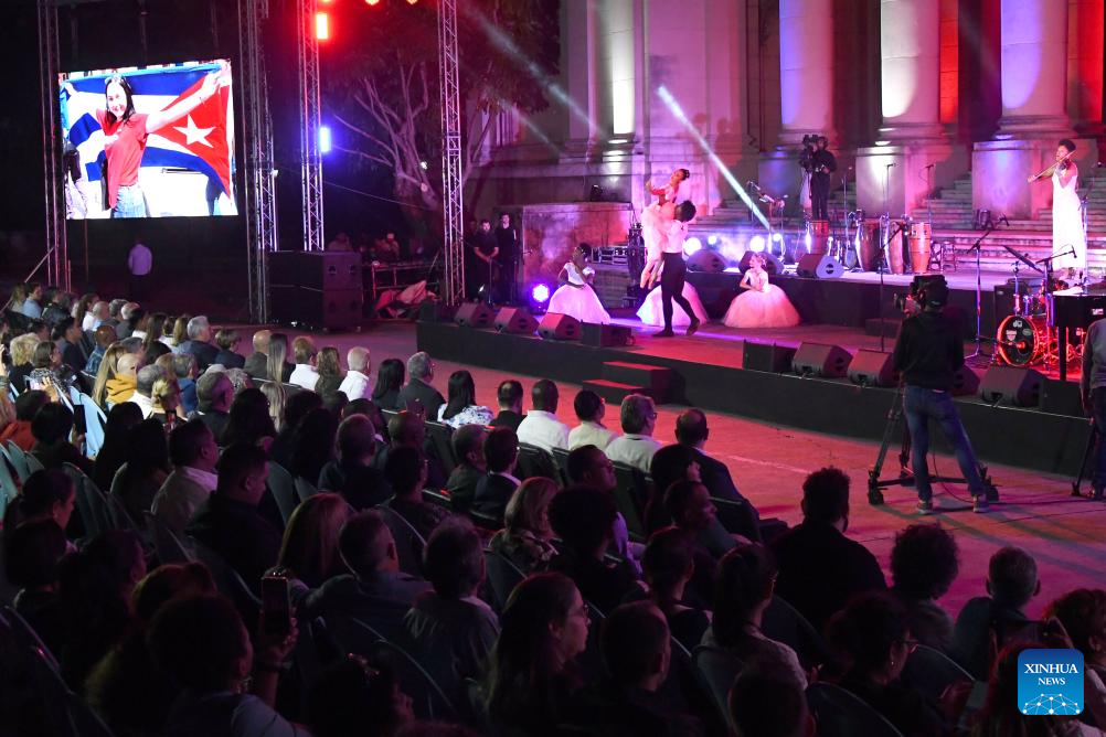 Imagen del 19 de marzo de 2025 de bailarinas de una agrupación realizando una presentación en la gala de clausura del IV Coloquio Internacional Patria en la Plaza Ignacio Agramonte de la Universidad de La Habana, en La Habana, capital de Cuba. La búsqueda de una coordinación global para desarrollar estrategias contra hegemónicas marcó el cierre del IV Coloquio Internacional Patria, al que asistió el presidente cubano Miguel Díaz-Canel, junto a unos 400 expertos en comunicación política, de medio centenar de países. (Xinhua/Joaquín Hernández)