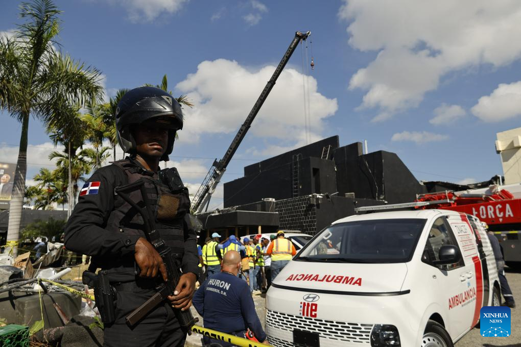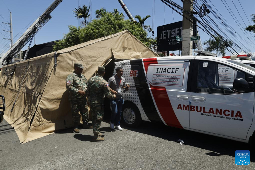 Un elemento de las fuerzas de seguridad vigila cerca de un vehículo del Instituto Nacional de Ciencias Forenses en el lugar donde se desplomó el techo de una discoteca, en Santo Domingo, República Dominicana, el 8 de abril de 2025. Al menos 44 personas murieron el martes tras desplomarse el techo de la discoteca "Jet Set" en la ciudad de Santo Domingo, capital de República Dominicana, confirmaron las autoridades locales. (Xinhua/Str)
