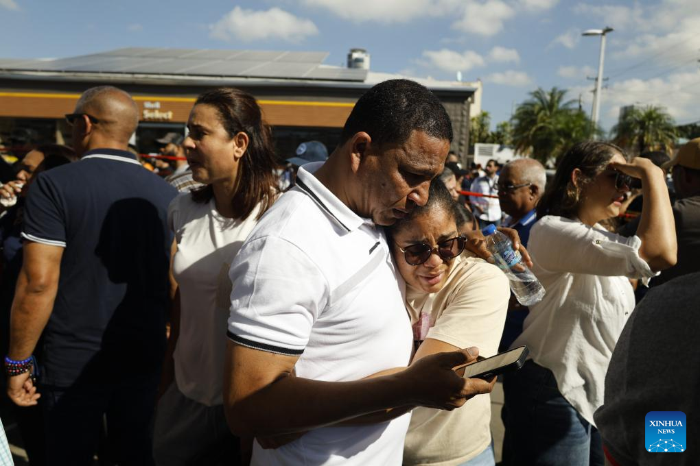 Personas reaccionan en el lugar donde se desplomó el techo de una discoteca, en Santo Domingo, República Dominicana, el 8 de abril de 2025. Al menos 44 personas murieron el martes tras desplomarse el techo de la discoteca "Jet Set" en la ciudad de Santo Domingo, capital de República Dominicana, confirmaron las autoridades locales. (Xinhua/Str)