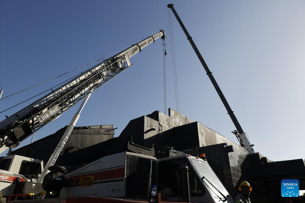 Grúas trabajan en el lugar donde se desplomó el techo de una discoteca, en Santo Domingo, República Dominicana, el 8 de abril de 2025. Al menos 44 personas murieron el martes tras desplomarse el techo de la discoteca "Jet Set" en la ciudad de Santo Domingo, capital de República Dominicana, confirmaron las autoridades locales. (Xinhua/Str)