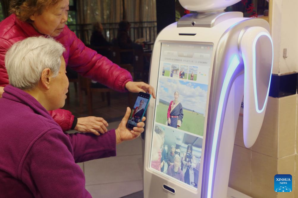 CHONGQING, 8 abril, 2025 (Xinhua) -- Imagen del 28 de marzo de 2025 de ancianos del Primer Hogar de Bienestar Social de Chongqing interactuando con el robot de cuidado de adultos mayores Peipei, en la municipalidad de Chongqing, en el suroeste de China. Un nuevo tipo de robot acaba de incorporarse a un centro de atención para adultos mayores en la municipalidad de Chongqing, en el suroeste de China, gracias a su habilidad para atender las complejas necesidades emocionales de las personas mayores. (Xinhua/Zhang Ya)