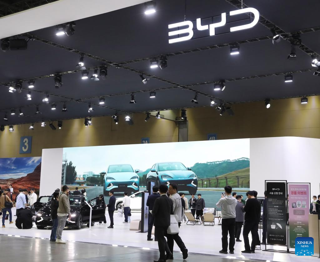 GOYANG, 8 abril, 2025 (Xinhua) -- Visitantes observan los vehículos en el estand del fabricante chino de vehículos eléctricos BYD durante el Salón de la Movilidad de Seúl 2025, en la ciudad de Goyang, en la provincia de Gyeonggi, República de Corea, el 8 de abril de 2025. El Salón de la Movilidad de Seúl 2025 se lleva a cabo aquí del 4 al 13 de abril. (Xinhua/Yao Qilin)