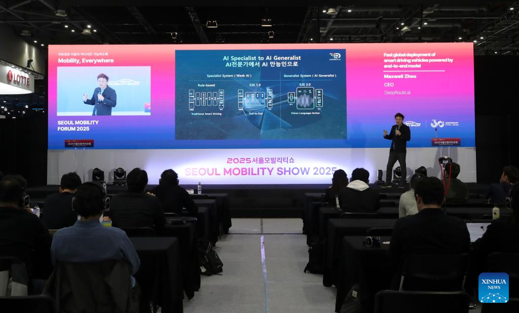 GOYANG, 8 abril, 2025 (Xinhua) -- Maxwell Zhou, director ejecutivo de DeepRoute.ai, una empresa china especializada en tecnologías de conducción inteligente, realiza una presentación durante el Salón de la Movilidad de Seúl 2025, en la ciudad de Goyang, en la provincia de Gyeonggi, República de Corea, el 8 de abril de 2025. El Salón de la Movilidad de Seúl 2025 se lleva a cabo aquí del 4 al 13 de abril. (Xinhua/Yao Qilin)