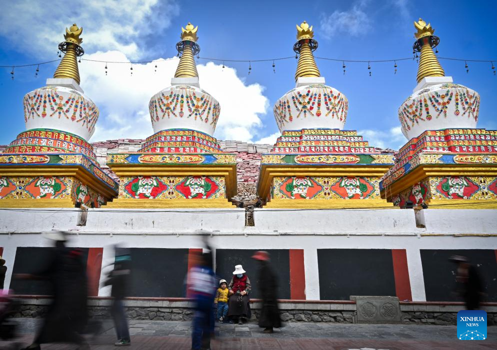 YUSHU, 8 abril, 2025 (Xinhua) -- Imagen del 6 de abril de 2025 de personas orando mientras rodean el montículo de piedras mani de Jiana, en la ciudad de Yushu, en la prefectura autónoma tibetana de Yushu, en la provincia de Qinghai, en el noroeste de China. El montículo de piedras mani de Jiana es una reliquia cultural bajo protección nacional. Está compuesto por miles de millones de piedras mani y es utilizado por los habitantes cuando sostienen ruedas de oración y murmuran la oración de seis sílabas para cumplir su ritual diario. (Xinhua/Zhang Hongxiang)