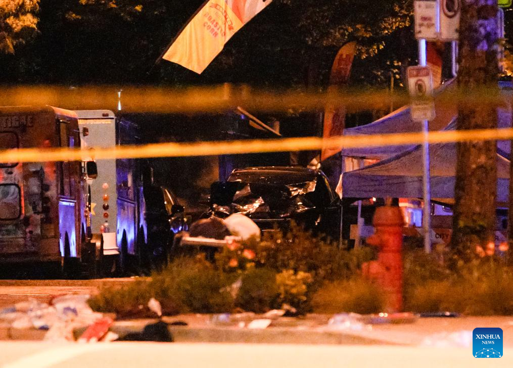 Imagen del 27 de abril de 2025 del automóvil que fue conducido contra una multitud, en Vancouver, Canadá. Se ha confirmado la muerte de nueve personas como consecuencia del atropello masivo ocurrido la noche del sábado en una calle de Vancouver, Canadá, durante la celebración de un festival callejero, informó el domingo la Policía local. (Xinhua/Liang Sen)
