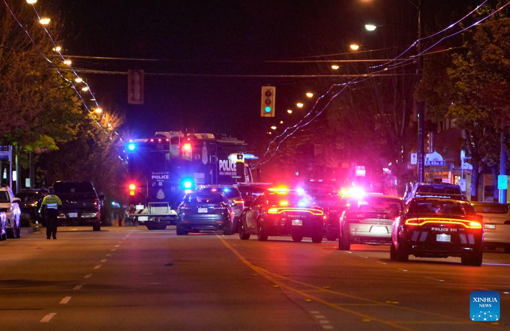Imagen del 27 de abril de 2025 de vehículos de la policía en el sitio de un atropello masivo, en Vancouver, Canadá. Se ha confirmado la muerte de nueve personas como consecuencia del atropello masivo ocurrido la noche del sábado en una calle de Vancouver, Canadá, durante la celebración de un festival callejero, informó el domingo la Policía local. (Xinhua/Liang Sen)