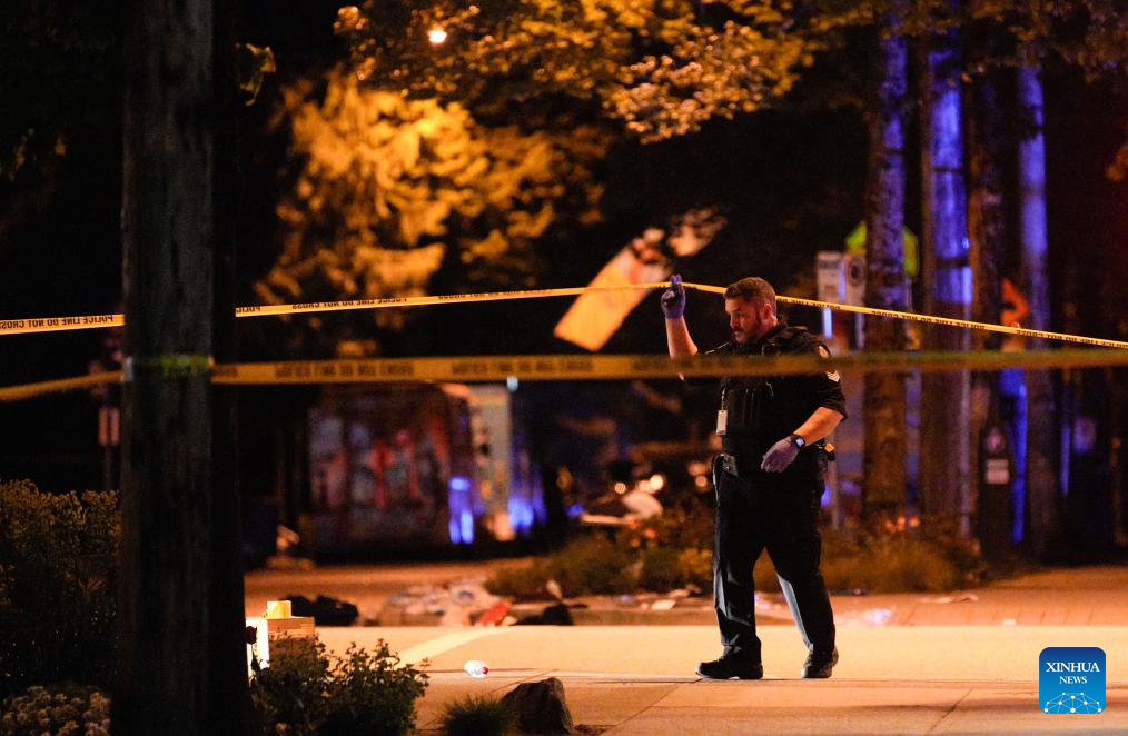 Un policía trabaja en el sitio de un atropello masivo, en Vancouver, Canadá, el 27 de abril de 2025. Se ha confirmado la muerte de nueve personas como consecuencia del atropello masivo ocurrido la noche del sábado en una calle de Vancouver, Canadá, durante la celebración de un festival callejero, informó el domingo la Policía local. (Xinhua/Liang Sen)