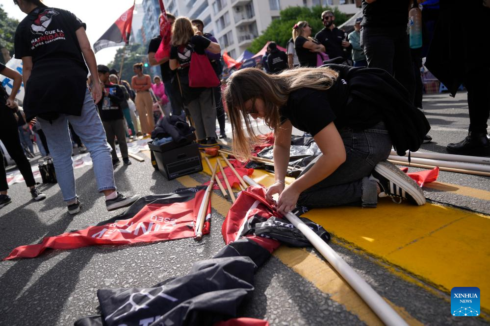 Una mujer prepara unas banderas para participar en un acto conmemorativo por el Día Internacional de los Trabajadores, en Montevideo, capital de Uruguay, el 1 de mayo de 2025. La central única sindical de Uruguay, el Plenario Intersindical de Trabajadores-Convención Nacional de Trabajadores, propuso el jueves sustituir el aporte patronal a la seguridad social por un impuesto a las ganancias de las empresas para financiar el sistema jubilatorio, en su proclama por el Día Internacional de los Trabajadores. (Xinhua/Nicolás Celaya)