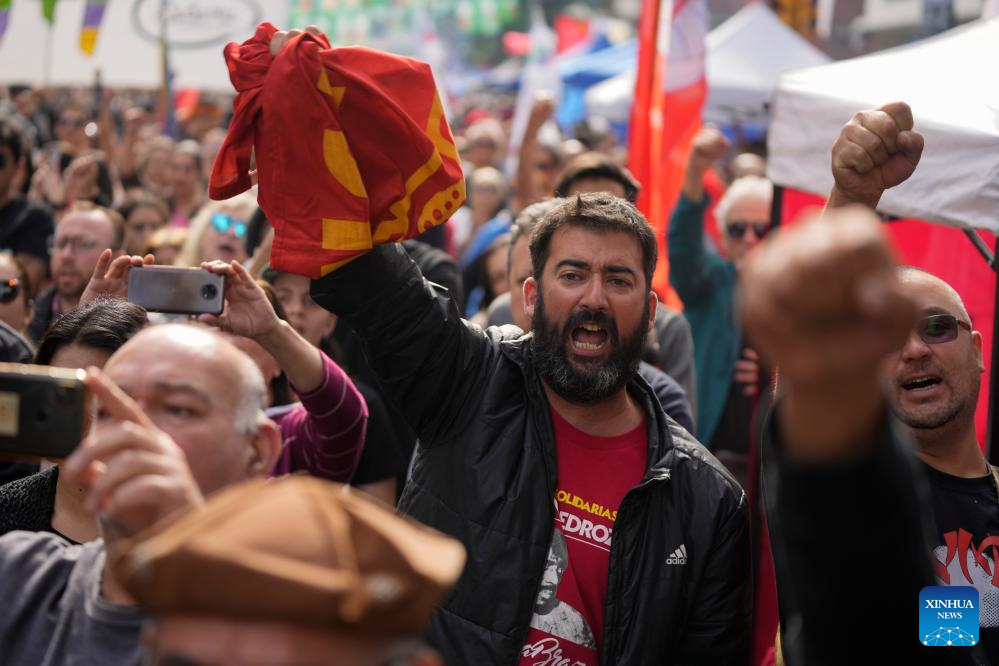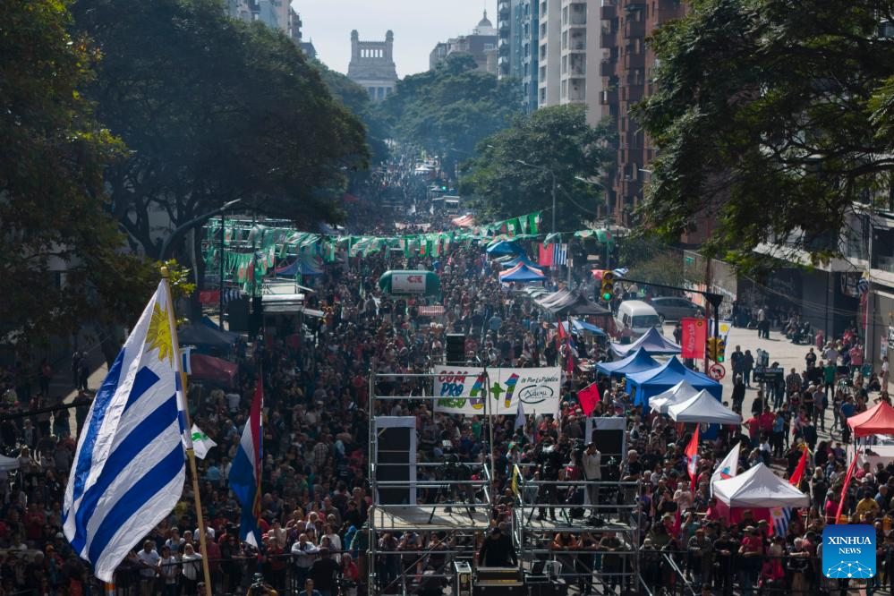 MONTEVIDEO, 1 mayo, 2025 (Xinhua) -- Trabajadores asisten a un acto conmemorativo por el Día Internacional de los Trabajadores, en Montevideo, capital de Uruguay, el 1 de mayo de 2025. La central única sindical de Uruguay, el Plenario Intersindical de Trabajadores-Convención Nacional de Trabajadores, propuso el jueves sustituir el aporte patronal a la seguridad social por un impuesto a las ganancias de las empresas para financiar el sistema jubilatorio, en su proclama por el Día Internacional de los Trabajadores. (Xinhua/Nicolás Celaya)