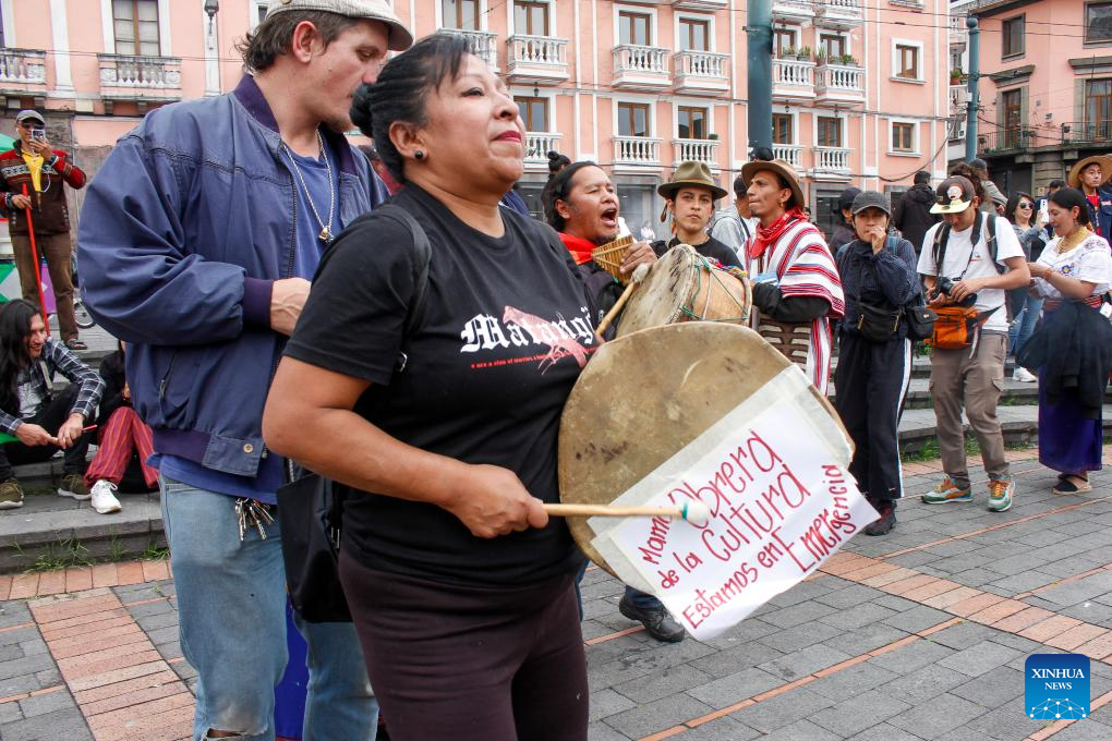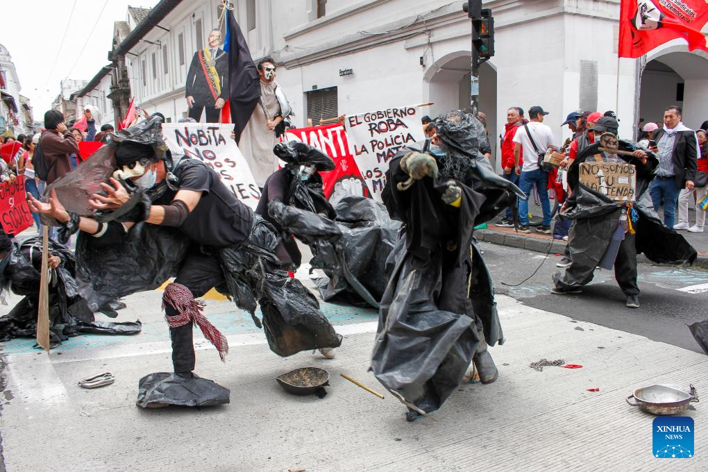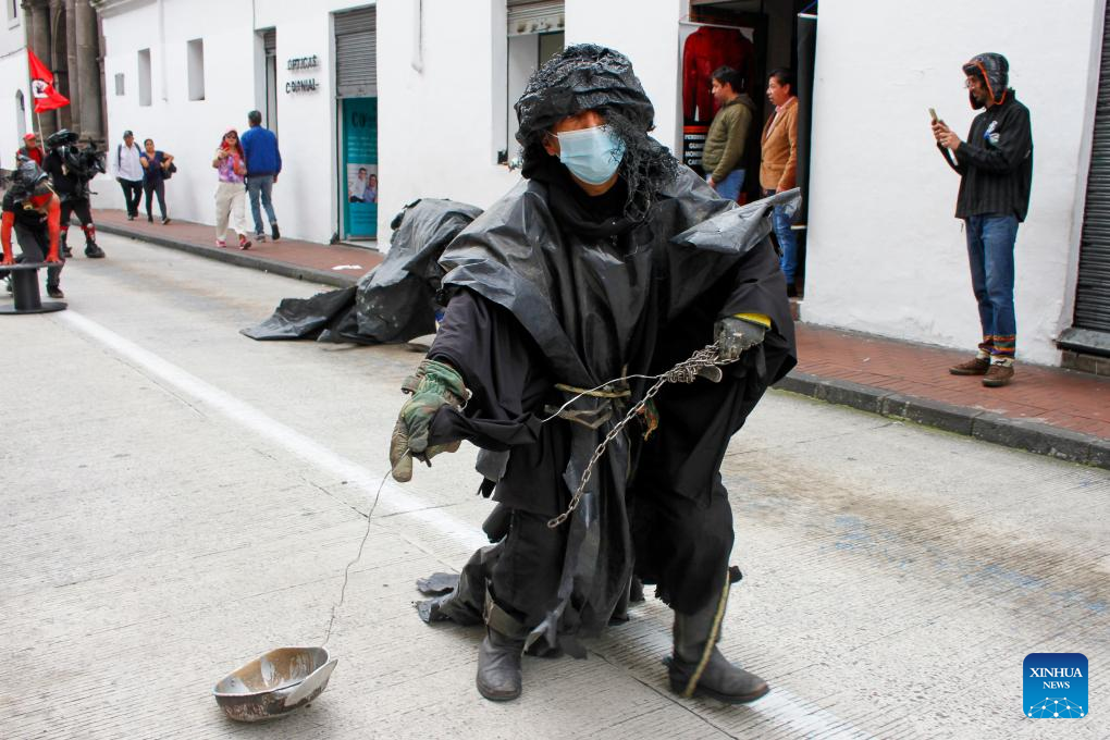 QUITO, 1 mayo, 2025 (Xinhua) -- Personas realizan una presentación durante una marcha para conmemorar el Día Internacional de los Trabajadores, en la ciudad de Quito, capital de Ecuador, el 1 de mayo de 2025. Cientos de trabajadores, sindicalistas y jubilados de Ecuador se movilizaron el jueves en las principales ciudades del país para conmemorar el Día Internacional de los Trabajadores o Día del Trabajo, exigiendo al Gobierno mejoras laborales en medio de un deterioro de los indicadores de empleo. (Xinhua/Ricardo Landeta)