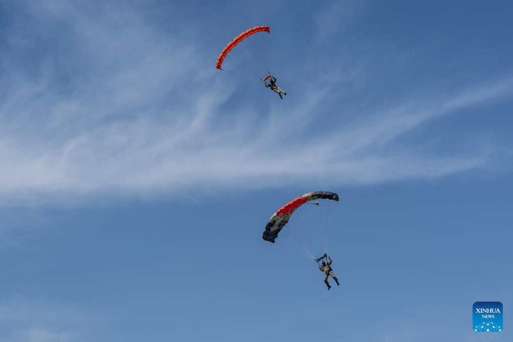 PRETORIA, 3 mayo, 2025 (Xinhua) -- Paracaidistas realizan una presentación durante la Exhibición Aérea del Museo de la Fuerza Aérea Sudafricana (SAAF, por sus siglas en inglés), en Pretoria, Sudáfrica, el 3 de mayo de 2025. La anual Exhibición Aérea del Museo de la SAAF se realizó aquí el sábado. (Xinhua/Shiraaz Mohamed)