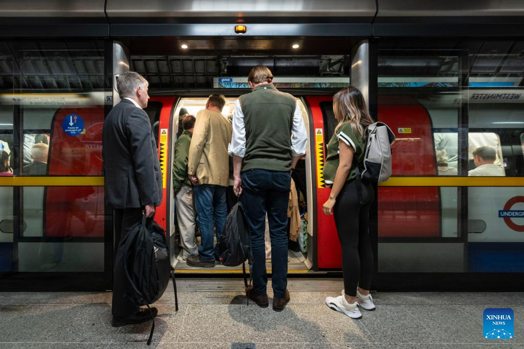 Imagen del 12 de mayo de 2025 de viajeros abordando un tren abarrotado de la línea Jubilee en la estación de Westminster, en Londres, Reino Unido. Un apagón afectó al metro de Londres, causando interrupciones generalizadas en los viajes por la capital el lunes por la tarde, confirmó Transport for London. (Xinhua/Stephen Chung)