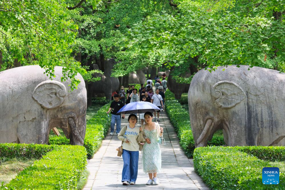 BEIJING, 19 mayo, 2025 (Xinhua) -- Personas visitan el mausoleo imperial de Xiaoling, lugar de entierro del emperador fundador de la dinastía Ming (1368-1644), Zhu Yuanzhang, en Nanjing, en la provincia de Jiangsu, en el este de China, el 19 de mayo de 2025. El 19 de mayo de este año se celebra el 15° Día del Turismo de China. (Xinhua/Su Yang)