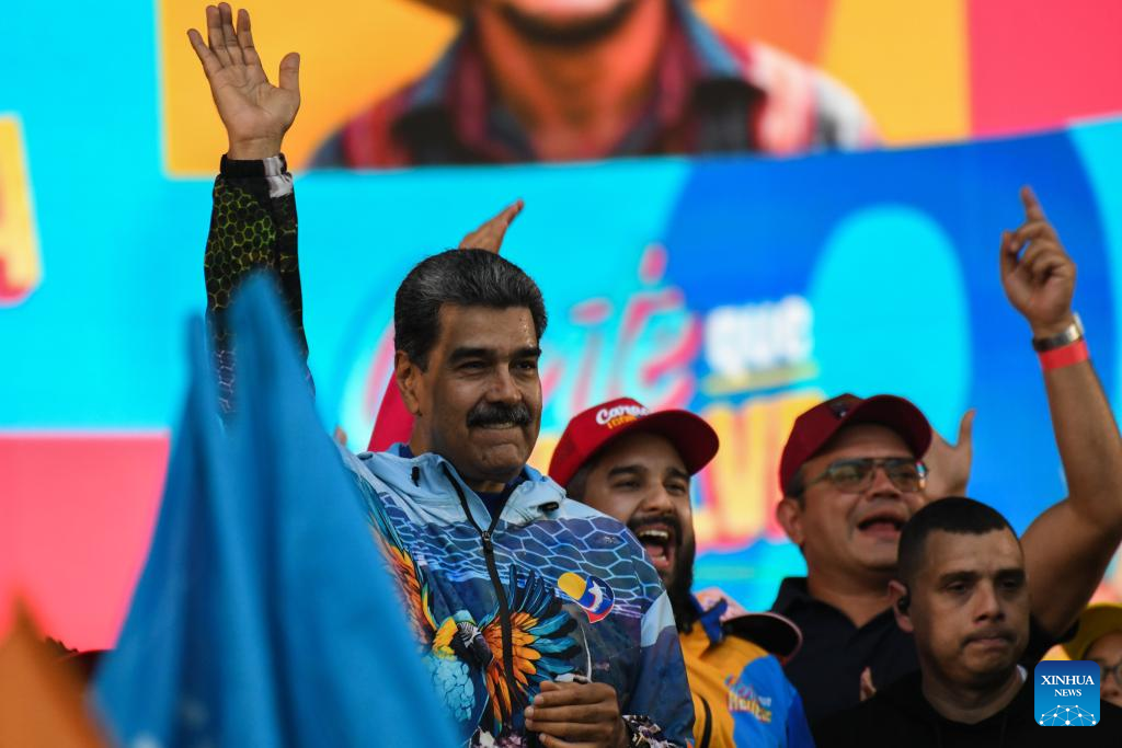 Imagen del 22 de mayo de 2025 del presidente venezolano, Nicolás Maduro, reaccionando durante un acto con motivo del cierre de campaña correspondiente a las elecciones legislativas y regionales, en Caracas, Venezuela. El chavismo y la oposición se movilizaron el jueves en toda Venezuela en el marco del cierre de campaña para las elecciones legislativas y regionales del próximo 25 de mayo. (Xinhua/Marcos Salgado)