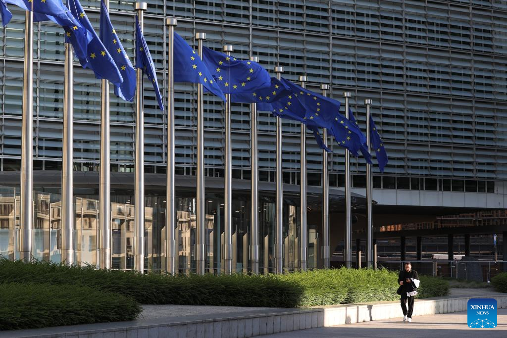 Imagen del 23 de mayo de 2025 de banderas de la Unión Europea en la sede de la Comisión Europea, en Bruselas, Bélgica. El presidente de Estados Unidos, Donald Trump, amenazó el viernes con imponer un impuesto de 50 por ciento a todas las importaciones provenientes de la Unión Europea, y un arancel de 25 por ciento a los productos de Apple a menos que los iPhones sean fabricados en Estados Unidos. (Xinhua/Zhao Dingzhe)
