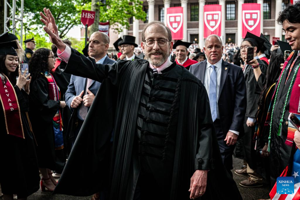 Imagen del 29 de mayo de 2025 del rector de la Universidad de Harvard, Alan Garber, interactuando con estudiantes durante la ceremonia de graduación en la Universidad de Harvard, en Cambridge, Massachusetts, Estados Unidos. Una jueza federal de Estados Unidos extendió el jueves una Orden de Restricción Temporal sobre la política de la administración Trump que pretende impedir que la Universidad de Harvard matricule a estudiantes internacionales. (Xinhua/Ziyu Julian Zhu)