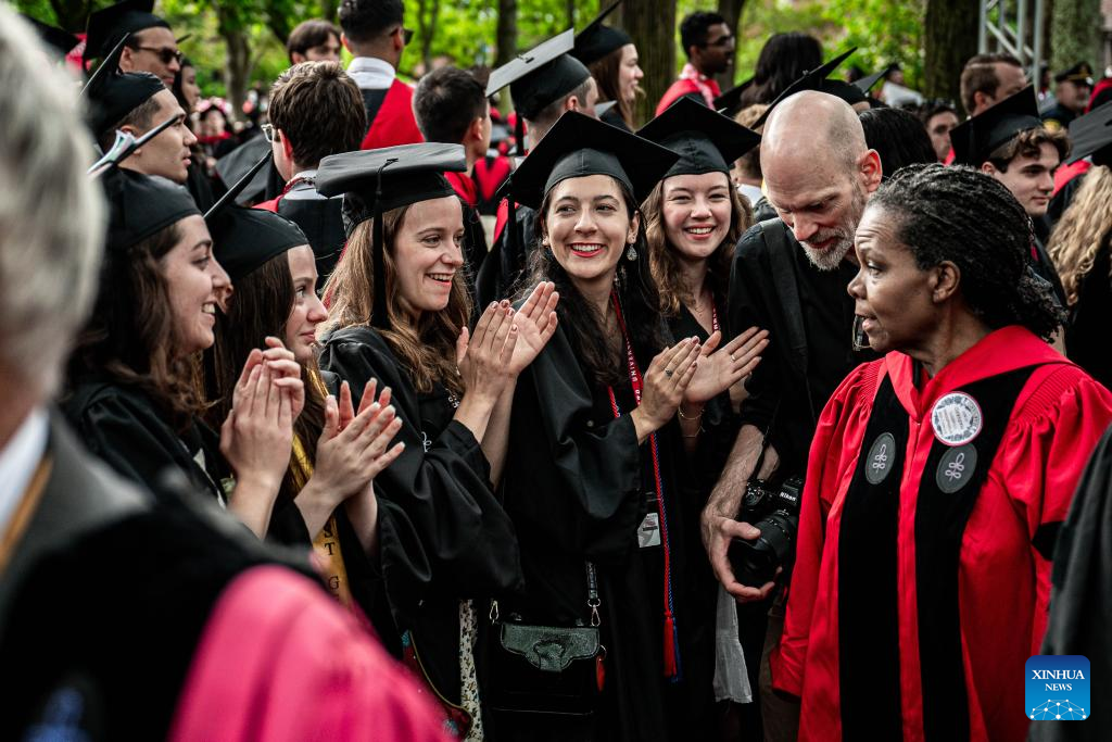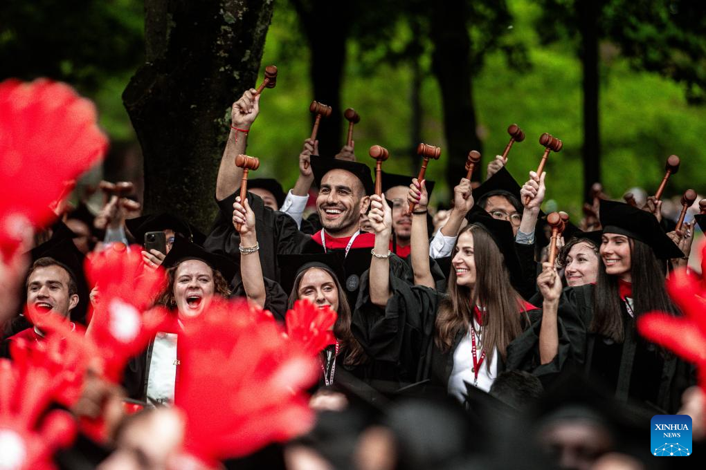 Imagen del 29 de mayo de 2025 de estudiantes asistiendo a la ceremonia de graduación en la Universidad de Harvard, en Cambridge, Massachusetts, Estados Unidos. Una jueza federal de Estados Unidos extendió el jueves una Orden de Restricción Temporal sobre la política de la administración Trump que pretende impedir que la Universidad de Harvard matricule a estudiantes internacionales. (Xinhua/Ziyu Julian Zhu)