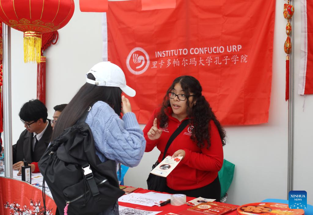 Imagen del 30 de mayo de 2025 de personas visitando el estand del Instituto Confucio de la Universidad Ricardo Palma durante la Gran Feria de Embajadas 2025 en la sede de la Villa Deportiva Nacional, en Lima, Perú. Representaciones diplomáticas de más de 30 países se reúnen en la capital peruana en el marco de la tercera edición de la Gran Feria de Embajadas 2025, que en esta ocasión busca promover una mayor integración cultural entre las naciones. (Xinhua/Mariana Bazo)
