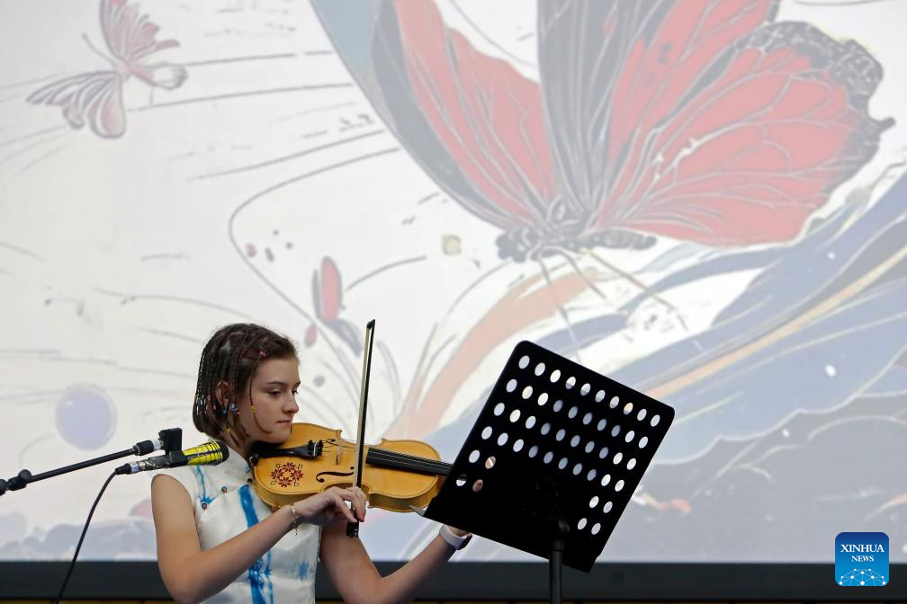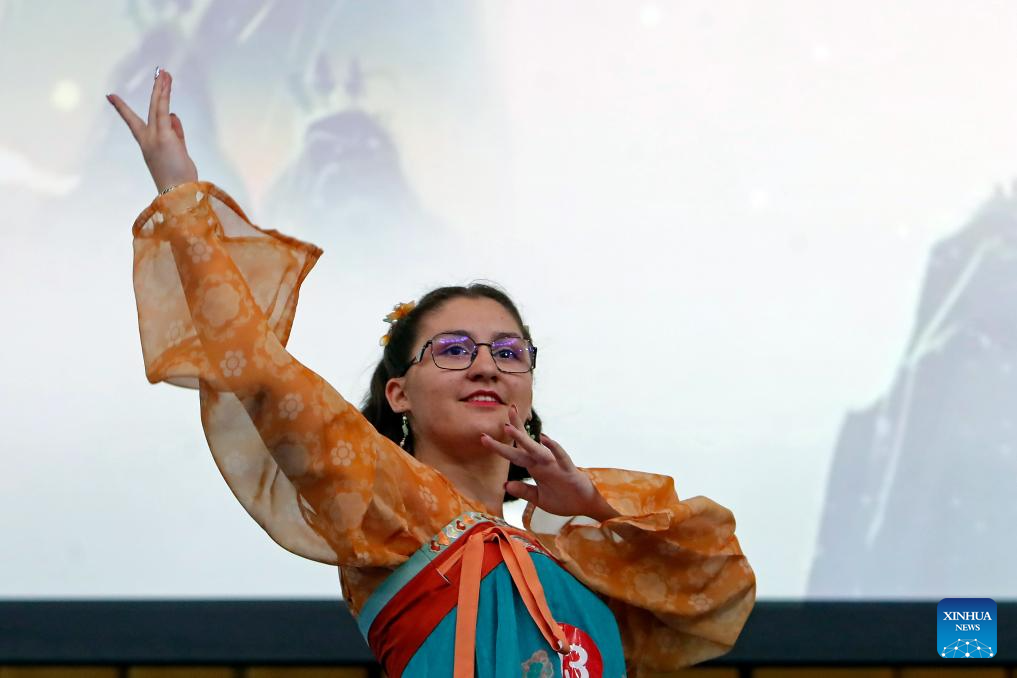 BUCAREST, 1 junio, 2025 (Xinhua) -- Imagen del 31 de mayo de 2025 de una concursante realizando una presentación durante el 18° Concurso de Dominio del Idioma Chino "Puente Chino" para Estudiantes Extranjeros de Secundaria, en Bucarest, Rumania. (Xinhua/Cristian Cristel)