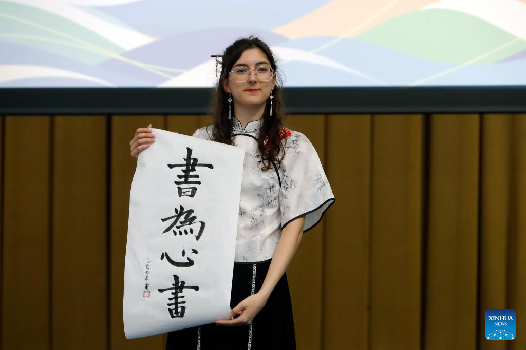 BUCAREST, 1 junio, 2025 (Xinhua) -- Imagen del 31 de mayo de 2025 de una concursante mostrando su trabajo de caligrafía durante el 18° Concurso de Dominio del Idioma Chino "Puente Chino" para Estudiantes Extranjeros de Secundaria, en Bucarest, Rumania. (Xinhua/Cristian Cristel)