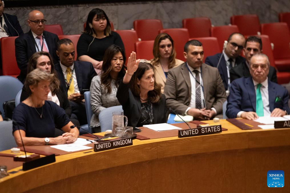 La representante interina de Estados Unidos ante las Naciones Unidas, Dorothy Shea (c-frente), vota en contra de un proyecto de resolución del Consejo de Seguridad de la ONU en la sede de la ONU, en Nueva York, el 4 de junio de 2025. Estados Unidos vetó el miércoles un proyecto de resolución del Consejo de Seguridad de la ONU que habría exigido un cese al fuego inmediato en Gaza y levantar de inmediato todas las restricciones a la ayuda humanitaria. (Xinhua/Xie E)