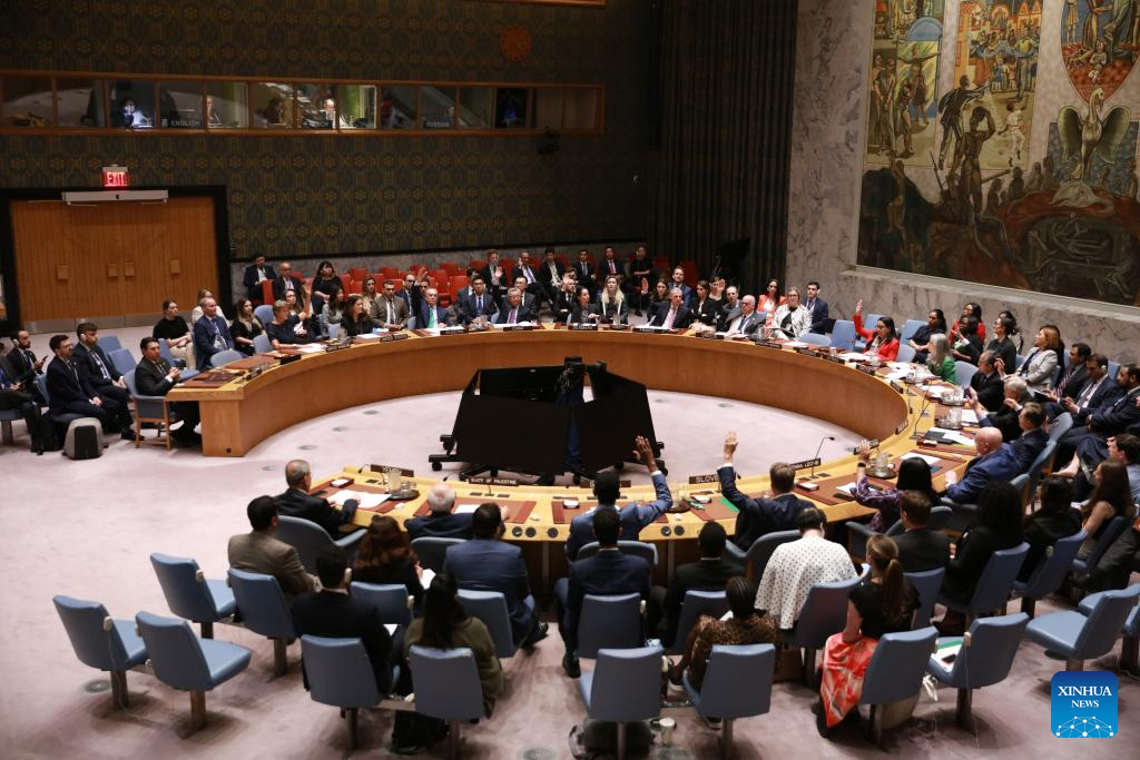 Representantes votan sobre un proyecto de resolución durante una reunión del Consejo de Seguridad de la ONU en la sede de la ONU, en Nueva York, el 4 de junio de 2025. Estados Unidos vetó el miércoles un proyecto de resolución del Consejo de Seguridad de la ONU que habría exigido un cese al fuego inmediato en Gaza y levantar de inmediato todas las restricciones a la ayuda humanitaria. (Xinhua/Xie E)