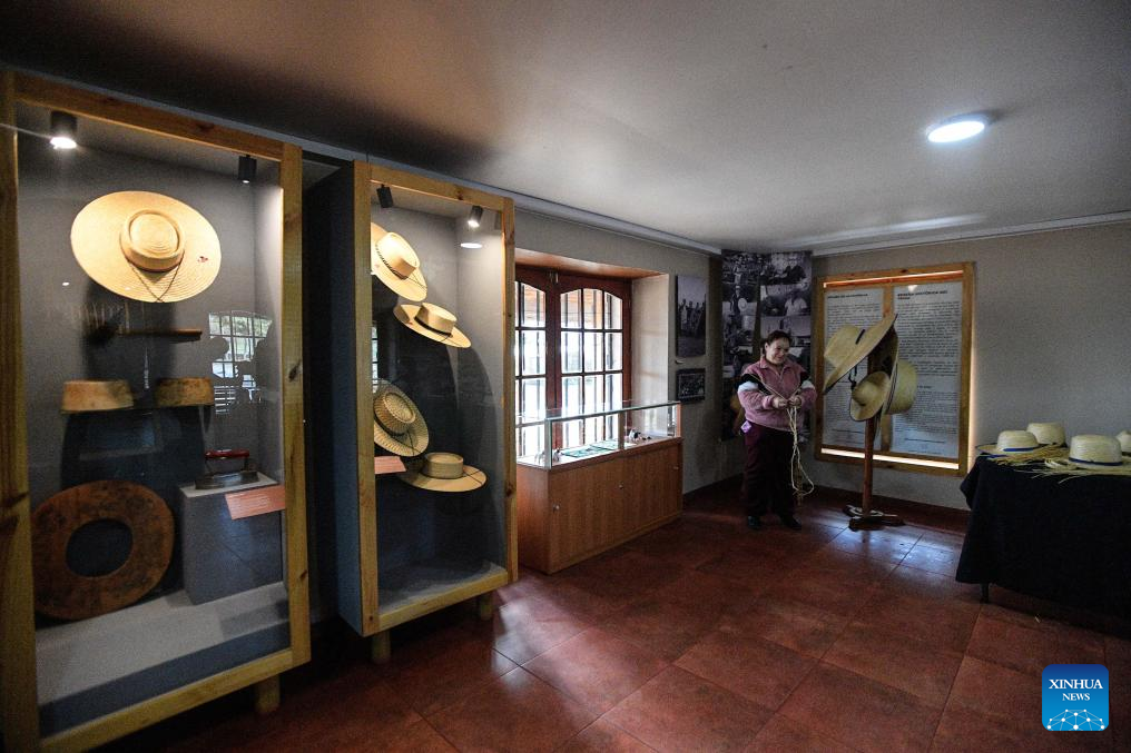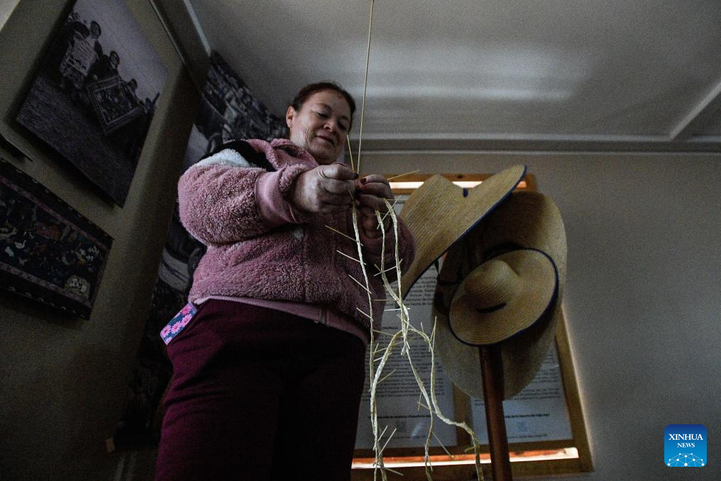 NINHUE, 26 junio, 2025 (Xinhua) -- Imagen del 13 de junio de 2025 de la artesana, Luzmira Larenas, realizando trenzas llamadas "cuelchas" mediante las cuales se confeccionan diferentes tipos de chupallas (sombrero tradicional chileno), en el Museo Vivo Artenin, en la comuna de Ninhue, en la provincia de Itata, en la región de Ñuble, Chile. El Instituto Nacional de Propiedad Industrial de Chile otorgó en 2018 la denominación de origen a la chupalla de Ninhue, certificación que lo caracteriza como un producto propio de su lugar geográfico y único en su tipo.(Xinhua/Jorge Villegas)