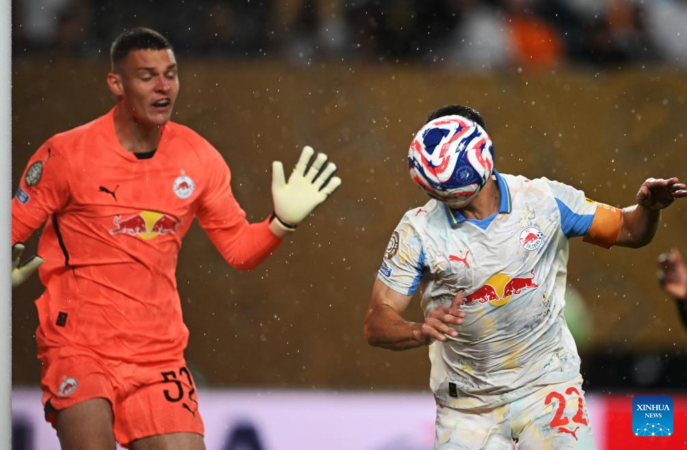 FILADELFIA, 27 junio, 2025 (Xinhua) -- Imagen del 26 de junio de 2025 de Stefan Lainer (d), de Red Bull Salzburg, compitiendo durante el partido de fútbol del grupo H entre Real Madrid, de España, y Red Bull Salzburg, de Austria, en la Copa Mundial de Clubes de la FIFA 2025, en Filadelfia, Estados Unidos. (Xinhua/Wu Xiaoling)