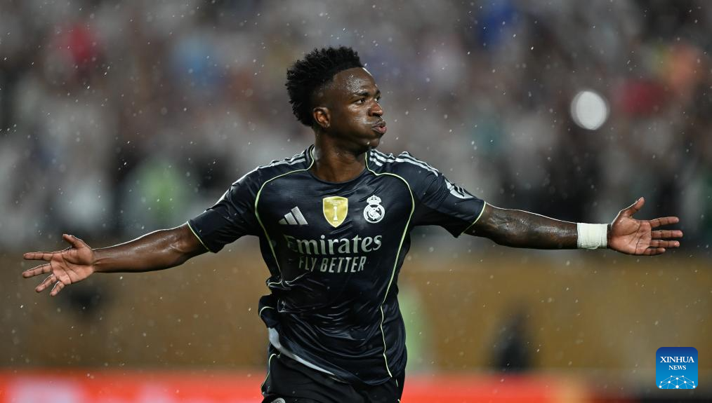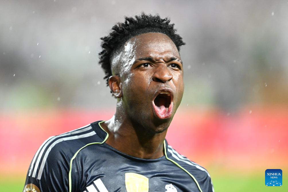 FILADELFIA, 27 junio, 2025 (Xinhua) -- Imagen del 26 de junio de 2025 de Vinicius Júnior, de Real Madrid, festejando una anotación durante el partido de fútbol del grupo H entre Real Madrid, de España, y Red Bull Salzburg, de Austria, en la Copa Mundial de Clubes de la FIFA 2025, en Filadelfia, Estados Unidos. (Xinhua/Wu Xiaoling)
