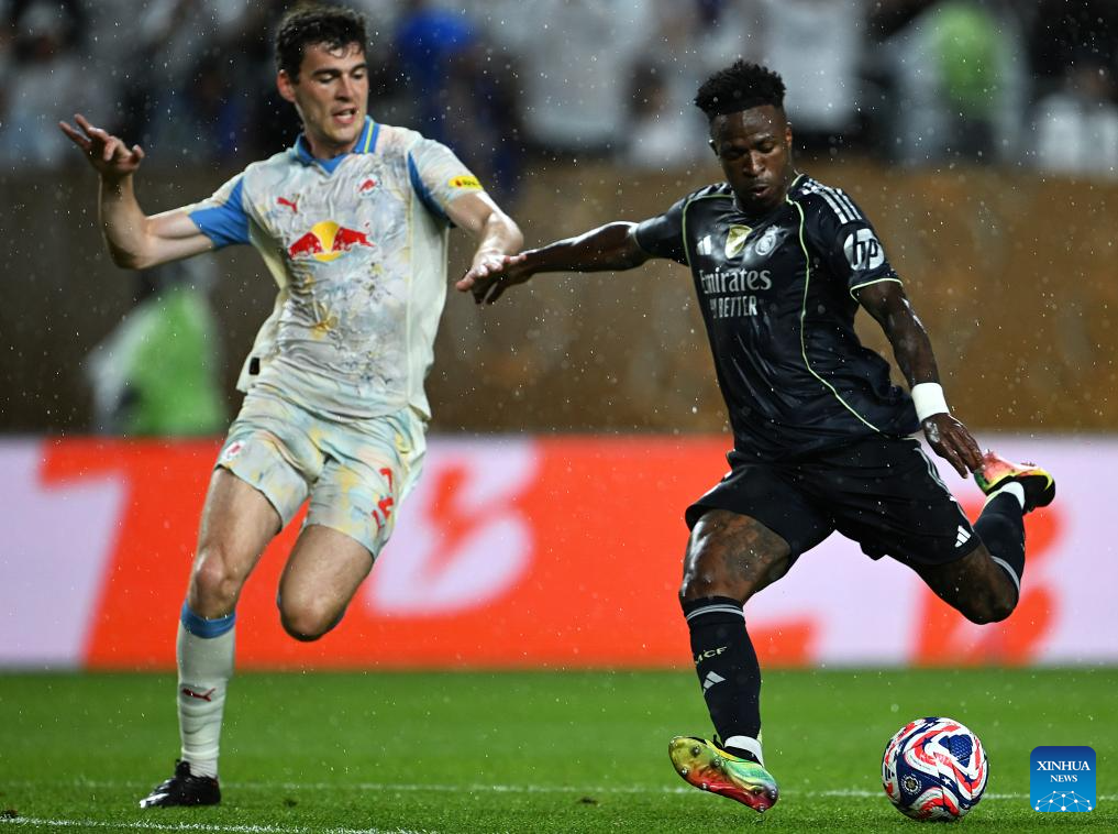 FILADELFIA, 27 junio, 2025 (Xinhua) -- Imagen del 26 de junio de 2025 de Vinicius Júnior (d), de Real Madrid, disparando el balón durante el partido de fútbol del grupo H entre Real Madrid, de España, y Red Bull Salzburg, de Austria, en la Copa Mundial de Clubes de la FIFA 2025, en Filadelfia, Estados Unidos. (Xinhua/Wu Xiaoling)