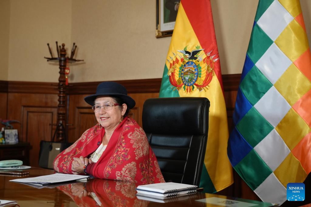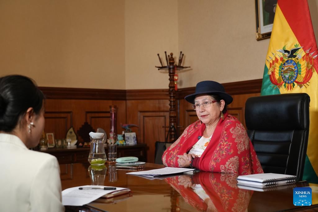 Imagen del 18 de junio de 2025 de la canciller boliviana, Celinda Sosa, participando en una entrevista con la Agencia de Noticias Xinhua, en La Paz, Bolivia. (Xinhua/He Bing)