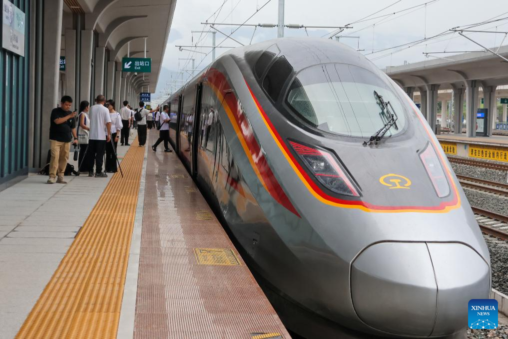 CHONGQING, 27 junio, 2025 (Xinhua) -- Un tren de alta velocidad llega a la Estación del Ferrocarril de Qianjiang en el tramo de Chongqing del ferrocarril de alta velocidad Chongqing-Xiamen, en Chongqing, en el suroeste de China, el 27 de junio de 2025. Un enlace ferroviario clave de alta velocidad en la municipalidad de Chongqing, en el suroeste de China, entró oficialmente en funcionamiento el viernes, lo que marca un paso significativo en el establecimiento de una arteria de transporte vital que conecta la región interior del país con la costa sureste. (Xinhua/Lei Mingyu)