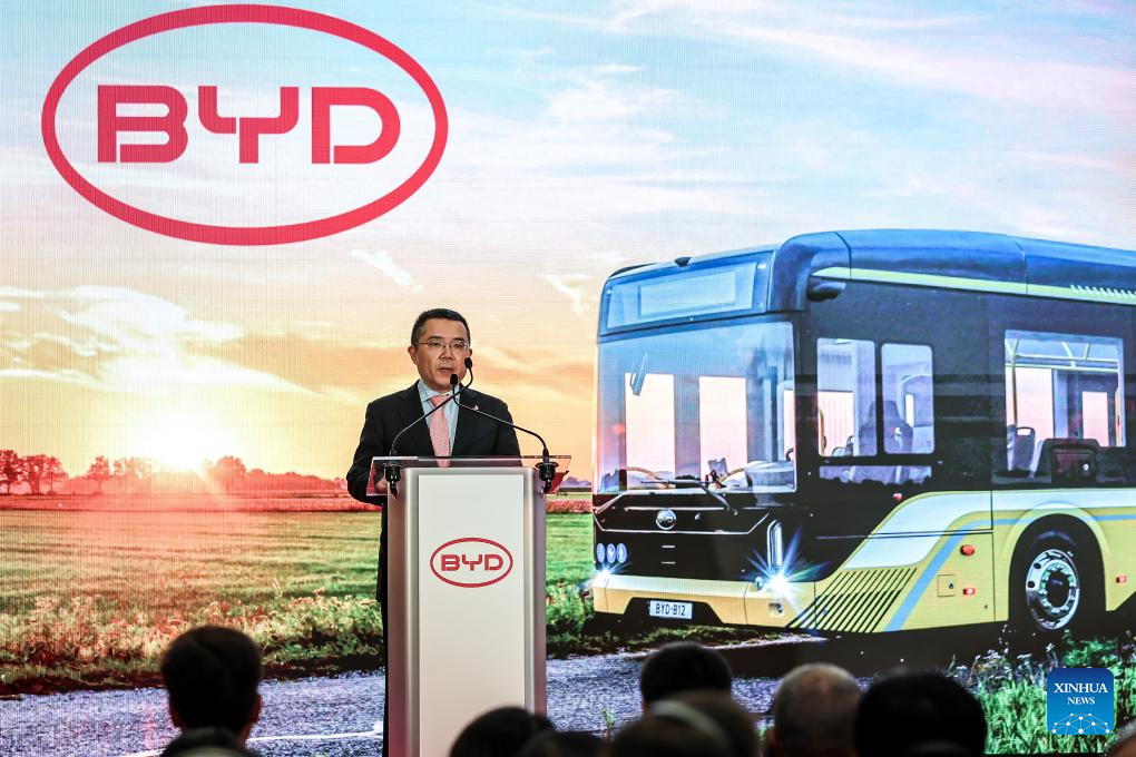 KOMAROM, 27 junio, 2025 (Xinhua) -- El embajador de China en Hungría, Gong Tao, habla en la ceremonia de colocación de la primera piedra para la ampliación de la planta de BYD, en Komarom, en el norte de Hungría, el 27 de junio de 2025. El fabricante chino de vehículos de nueva energía BYD colocó el viernes la primera piedra para la ampliación de su planta de autobuses y camiones eléctricos en Komarom, en el norte de Hungría, lo que marca un paso significativo en la estrategia de crecimiento de la compañía en Europa. La inversión incluye el desarrollo de una nueva planta de producción de 29.000 metros cuadrados, que se espera genere más de 600 nuevos empleos en la región. (Xinhua/David Balogh)