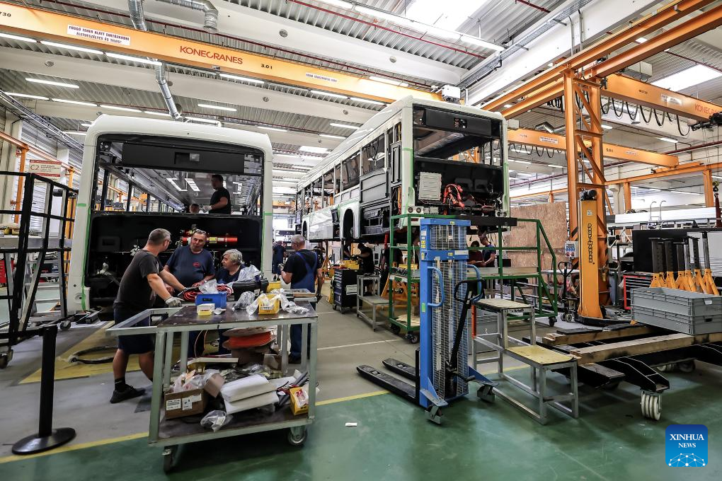 KOMAROM, 27 junio, 2025 (Xinhua) -- Trabajadores laboran en la planta de autobuses y camiones eléctricos de BYD, en Komarom, en el norte de Hungría, el 27 de junio de 2025. El fabricante chino de vehículos de nueva energía BYD colocó el viernes la primera piedra para la ampliación de su planta de autobuses y camiones eléctricos en Komarom, en el norte de Hungría, lo que marca un paso significativo en la estrategia de crecimiento de la compañía en Europa. La inversión incluye el desarrollo de una nueva planta de producción de 29.000 metros cuadrados, que se espera genere más de 600 nuevos empleos en la región. (Xinhua/David Balogh)