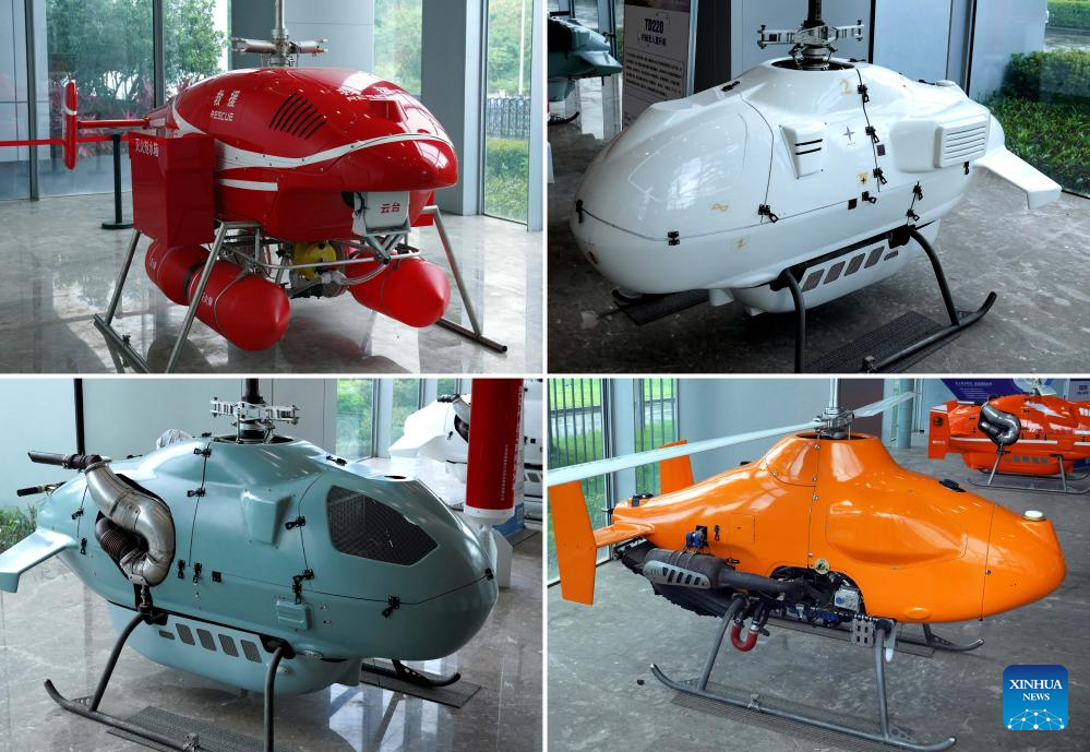 SHENZHEN, 27 junio, 2025 (Xinhua) -- Imagen combinada del 26 de junio de 2025 de helicópteros no tripulados en una sala de exposiciones del United Aircraft Group, en Shenzhen, en la provincia de Guangdong, en el sur de China. Guangdong ha posicionado su floreciente economía de baja altitud como un motor clave para desarrollar nuevas fuerzas productivas de calidad y cultivar nuevos puntos de crecimiento económico. Shenzhen destaca como la "Capital de los Drones" de China, con una concentración de más de 1.700 empresas relacionadas con los drones. (Xinhua/Li An)