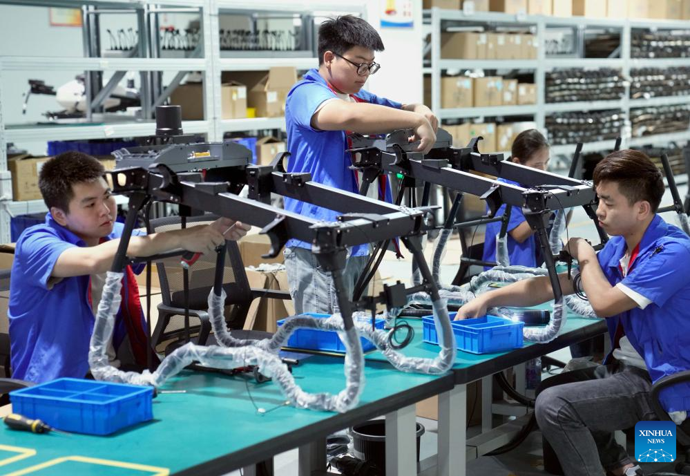 SHENZHEN, 27 junio, 2025 (Xinhua) -- Imagen del 26 de junio de 2025 de trabajadores ensamblando vehículos aéreos no tripulados en el taller del United Aircraft Group, en Shenzhen, en la provincia de Guangdong, en el sur de China. Guangdong ha posicionado su floreciente economía de baja altitud como un motor clave para desarrollar nuevas fuerzas productivas de calidad y cultivar nuevos puntos de crecimiento económico. Shenzhen destaca como la "Capital de los Drones" de China, con una concentración de más de 1.700 empresas relacionadas con los drones. (Xinhua/Li An)