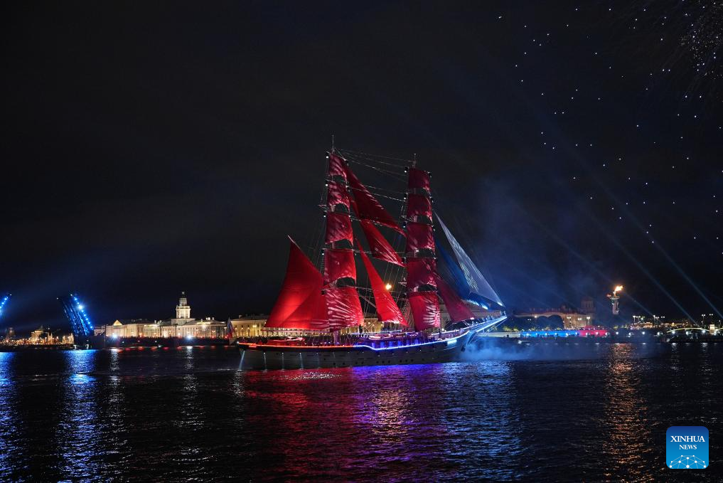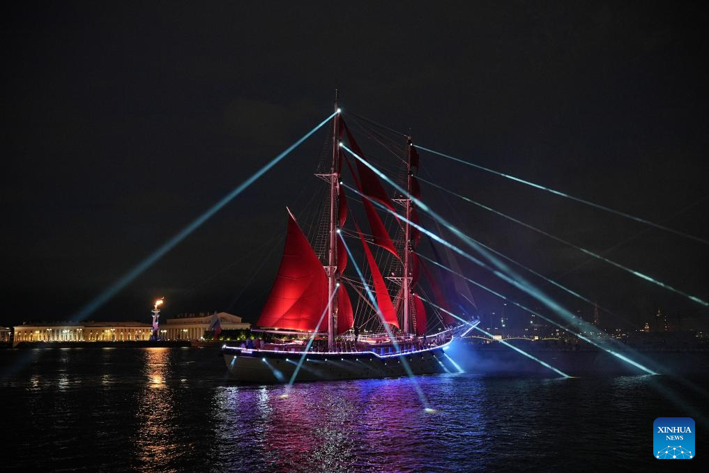 SAN PETERSBURGO, 29 junio, 2025 (Xinhua) -- Un barco con velas escarlatas es visto en el río Neva en celebración del festival Velas Escarlatas, en San Petersburgo, Rusia, el 29 de junio de 2025. San Petersburgo celebró el festival Velas Escarlatas el fin de semana para conmemorar la graduación escolar para los estudiantes. (Xinhua/An Xiaomeng)