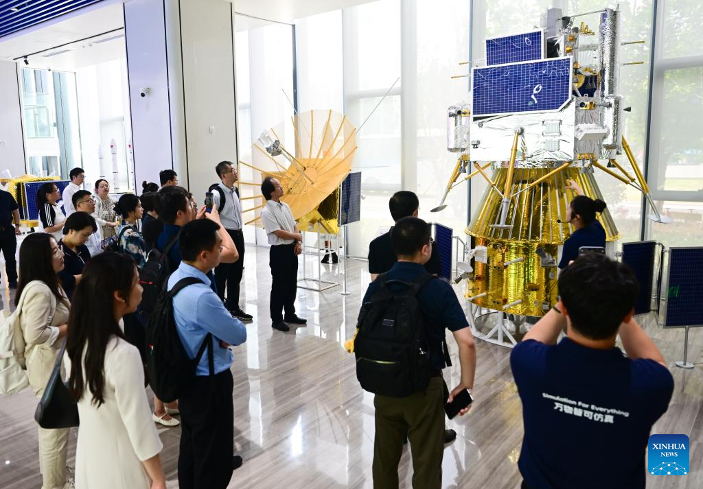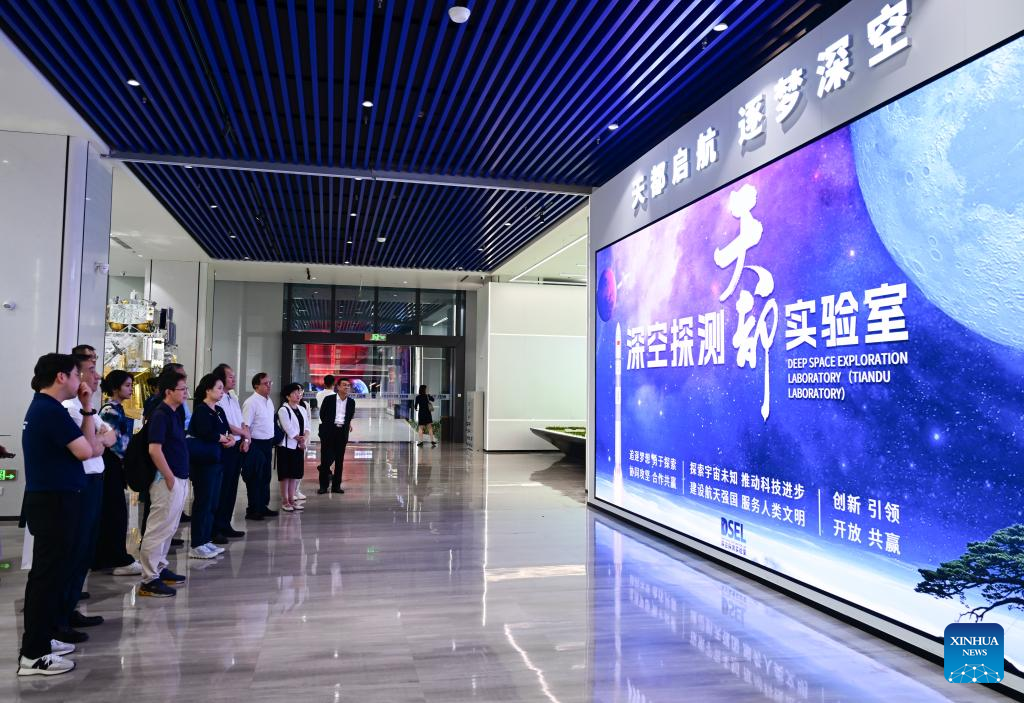 HEFEI, 7 julio, 2025 (Xinhua) -- Invitados visitan la sala de exposiciones del Laboratorio de Exploración del Espacio Profundo, en Hefei, en la provincia de Anhui, en el este de China, el 7 de julio de 2025. La Asociación Internacional para la Exploración del Espacio Profundo (IDSEA, por sus siglas en inglés), una organización académica internacional dedicada a explorar el espacio profundo, fue presentada oficialmente el lunes en Hefei. (Xinhua/Zhou Mu)