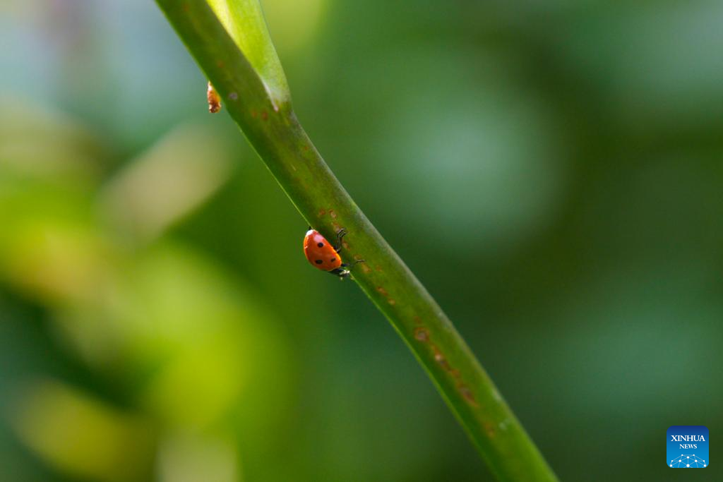 VARSOVIA, 17 julio, 2025 (Xinhua) -- Imagen del 16 de julio de 2025 de una catarina vista en el tallo de una flor en el jardín botánico de la Universidad de Varsovia, en Varsovia, Polonia. (Xinhua/Jaap Arriens)