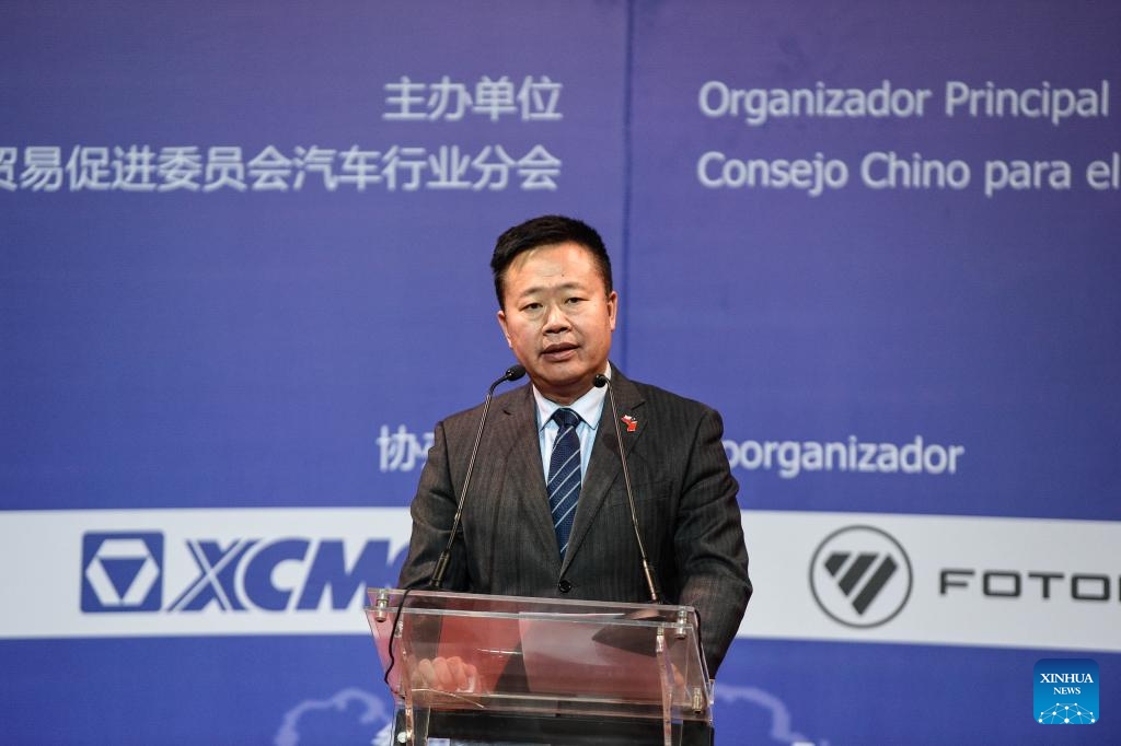 SANTIAGO, 26 julio, 2025 (Xinhua) -- Imagen del 25 de julio de 2025 del consejero económico y comercial de la Embajada de China en Chile, Ma Keqiang, pronunciando un discurso durante la ceremonia de apertura de la Segunda Exposición Itinerante Internacional de Automóviles Chinos 2025, en Santiago, capital de Chile. La Segunda Exposición Itinerante Internacional de Automóviles Chinos 2025 organizada por el Consejo Chino para el Fomento del Comercio Internacional, en la que participan quince marcas de autos chinos con una amplia variedad de unidades híbridas y eléctricas, se realiza en el país sudamericano entre el 24 y 27 de julio. (Xinhua/Jorge Villegas)