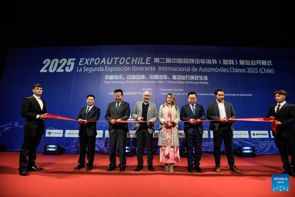 SANTIAGO, 26 julio, 2025 (Xinhua) -- Imagen del 25 de julio de 2025 del subsecretario del Ministerio de Transporte y Telecomunicaciones chileno, Jorge Daza (4-i), y el consejero económico y comercial de la Embajada de China en Chile, Ma Keqiang (3-i), participando en el corte de cinta durante la ceremonia de apertura de la Segunda Exposición Itinerante Internacional de Automóviles Chinos 2025, en Santiago, capital de Chile. La Segunda Exposición Itinerante Internacional de Automóviles Chinos 2025 organizada por el Consejo Chino para el Fomento del Comercio Internacional, en la que participan quince marcas de autos chinos con una amplia variedad de unidades híbridas y eléctricas, se realiza en el país sudamericano entre el 24 y 27 de julio. (Xinhua/Jorge Villegas)