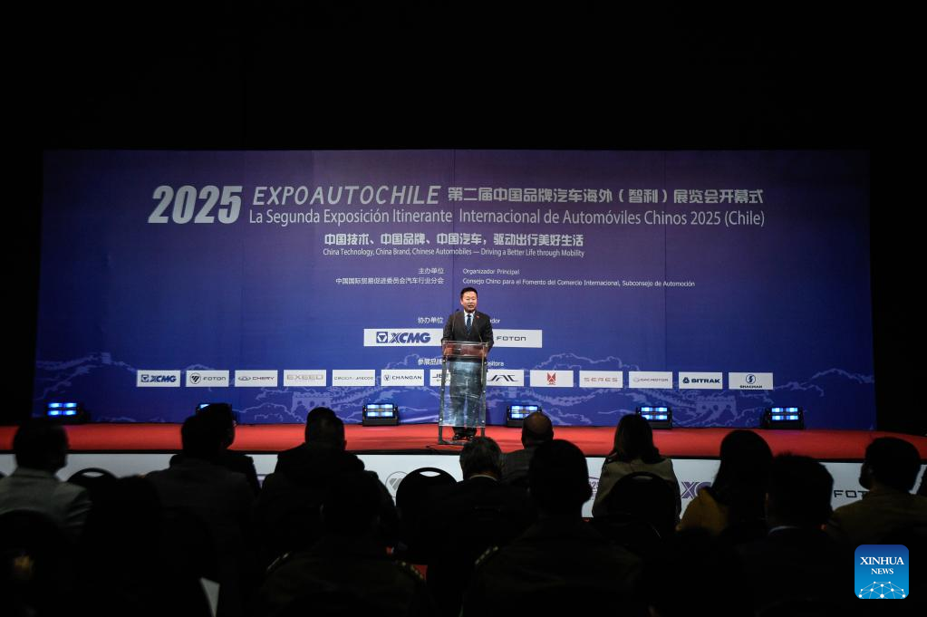 SANTIAGO, 26 julio, 2025 (Xinhua) -- Imagen del 25 de julio de 2025 del subsecretario del Ministerio de Transporte y Telecomunicaciones chileno, Jorge Daza, pronunciando un discurso durante la ceremonia de apertura de la Segunda Exposición Itinerante Internacional de Automóviles Chinos 2025, en Santiago, capital de Chile. La Segunda Exposición Itinerante Internacional de Automóviles Chinos 2025 organizada por el Consejo Chino para el Fomento del Comercio Internacional, en la que participan quince marcas de autos chinos con una amplia variedad de unidades híbridas y eléctricas, se realiza en el país sudamericano entre el 24 y 27 de julio. (Xinhua/Jorge Villegas)
