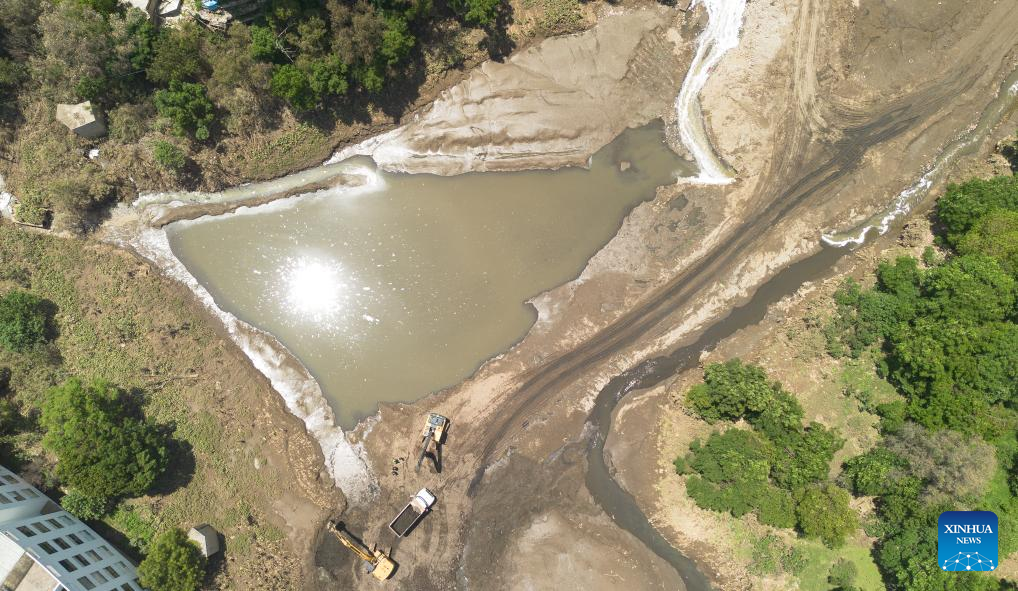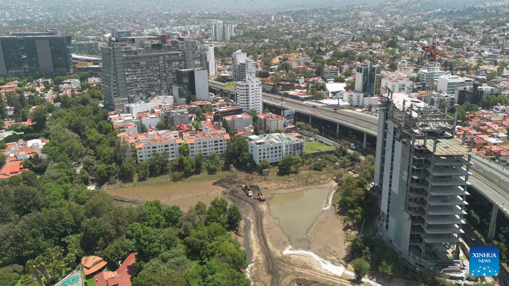 Imagen tomada con un dron el 29 de julio de 2025 de maquinaria trabajando en la presa Anzaldo, en la Ciudad de México, capital de México. México avanza en la modernización de sus sistemas meteorológicos mediante la implementación de la inteligencia artificial (IA) en los modelos de predicción, los cuales son capaces de prever hasta en menos de una hora fenómenos extremos como inundaciones súbitas, olas de calor y ciclones tropicales. (Xinhua/Francisco Cañedo)