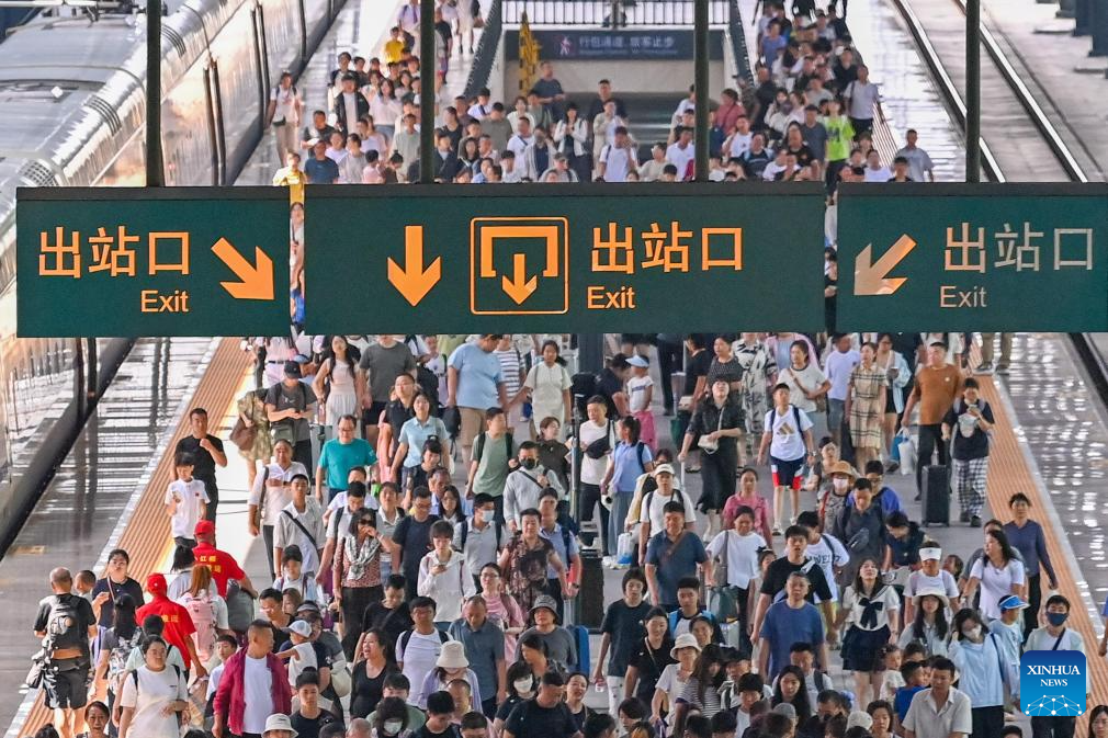 HARBIN, 2 agosto, 2025 (Xinhua) -- Pasajeros salen de la Estación del Ferrocarril de Harbin, en Harbin, en la provincia de Heilongjiang, en el noreste de China, el 2 de agosto de 2025. La temporada alta de viajes de verano de este año durará 62 días, del 1 de julio al 31 de agosto. Del 1 al 31 de julio, China Railway Harbin Bureau Group había gestionado 9,775 millones de viajes de pasajeros, y el promedio diario de viajes de pasajeros alcanzó los 315.000. (Xinhua/Yuan Yong)