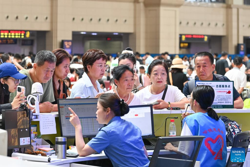 HARBIN, 2 agosto, 2025 (Xinhua) -- Trabajadoras responden a las preguntas de los pasajeros en la Estación del Ferrocarril de Harbin, en Harbin, en la provincia de Heilongjiang, en el noreste de China, el 2 de agosto de 2025. La temporada alta de viajes de verano de este año durará 62 días, del 1 de julio al 31 de agosto. Del 1 al 31 de julio, China Railway Harbin Bureau Group había gestionado 9,775 millones de viajes de pasajeros, y el promedio diario de viajes de pasajeros alcanzó los 315.000. (Xinhua/Yuan Yong)