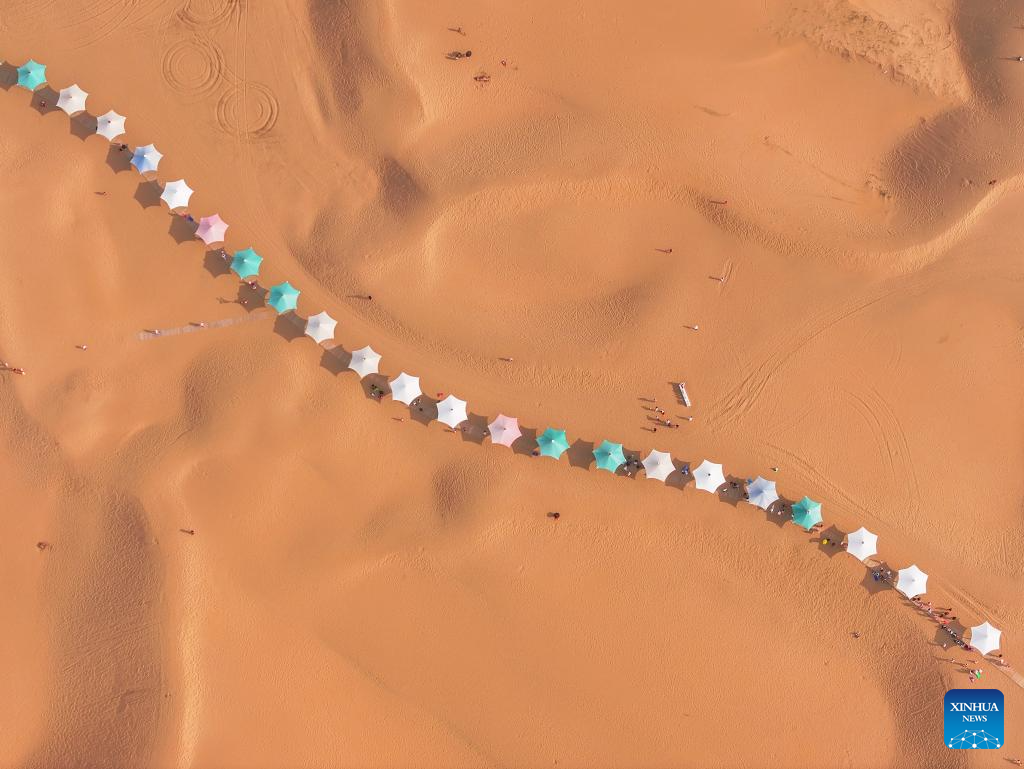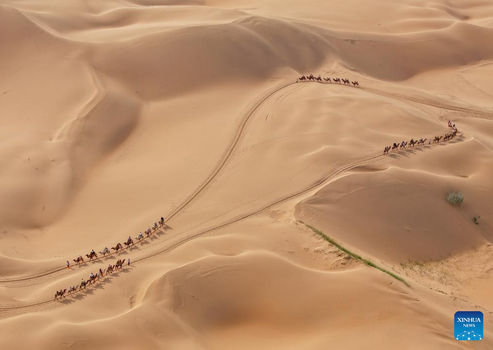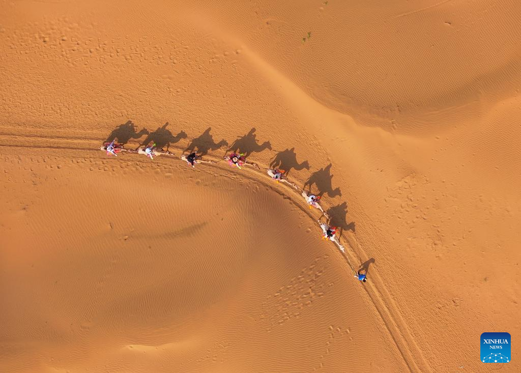 ERDOS, 2 agosto, 2025 (Xinhua) -- Vista aérea tomada con un dron el 1 de agosto de 2025 de personas montando camellos en un área escénica desértica, en la bandera de Dalad de la ciudad de Erdos, en la región autónoma de Mongolia Interior, en el norte de China. El desierto de Kubuqi, en la ciudad de Erdos, ha entrado en su temporada alta de turismo en pleno verano, atrayendo a numerosos turistas de todo el país para visitar. (Xinhua/Lian Zhen)