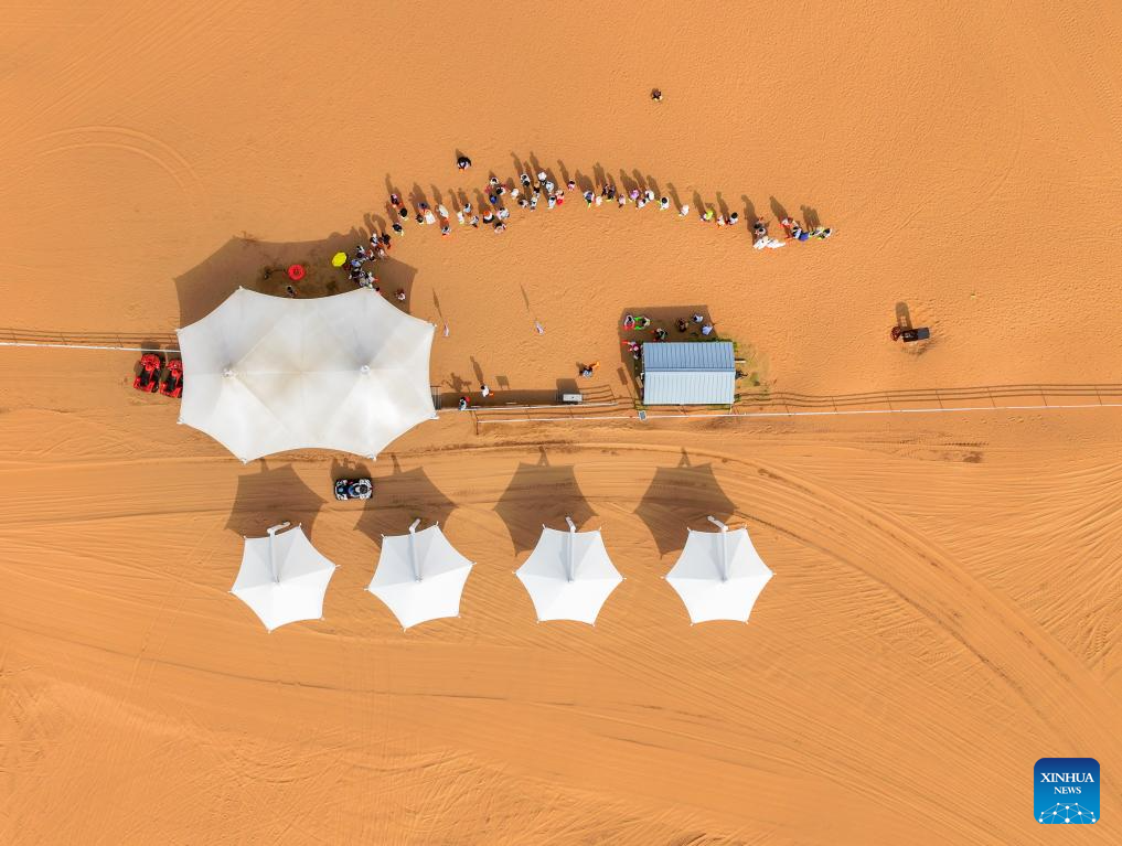 ERDOS, 2 agosto, 2025 (Xinhua) -- Vista aérea tomada con un dron el 1 de agosto de 2025 de personas haciendo fila para experimentar el todoterreno en el desierto, en la bandera de Dalad de la ciudad de Erdos, en la región autónoma de Mongolia Interior, en el norte de China. El desierto de Kubuqi, en la ciudad de Erdos, ha entrado en su temporada alta de turismo en pleno verano, atrayendo a numerosos turistas de todo el país para visitar. (Xinhua/Lian Zhen)