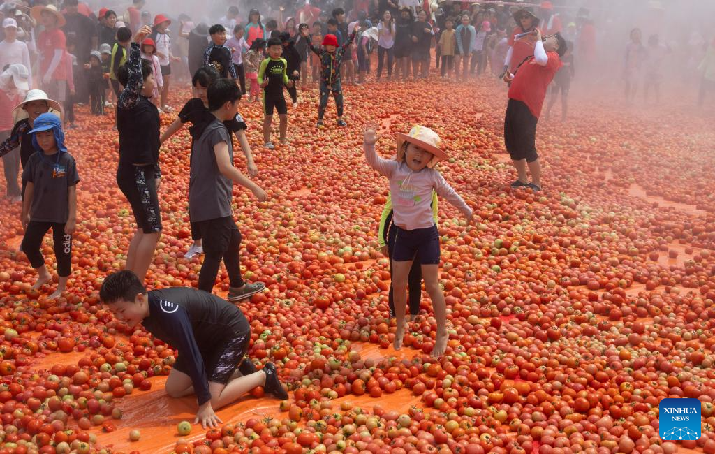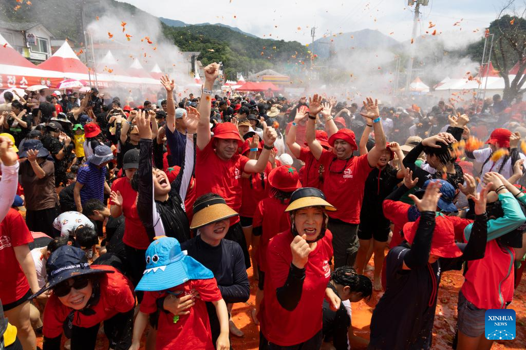 HWACHEON, 2 agosto, 2025 (Xinhua) -- Personas juegan en una piscina de tomates durante el Festival del Tomate de Hwacheon, en Hwacheon-gun, República de Corea, el 2 de agosto de 2025. (Xinhua/Jun Hyosang)