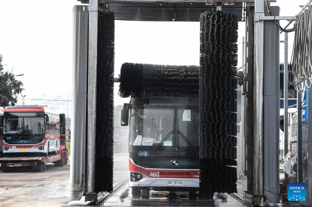 SANTIAGO, 7 agosto, 2025 (Xinhua) -- Imagen del 4 de agosto de 2025 de un autobús eléctrico de la marca china, King Long, entrando a una máquina de lavado en la casa matriz de la empresa chilena Vivipra, en la comuna de San Bernardo, en Santiago, capital de Chile. Tienen los mismos altos estándares de los cientos de autobuses que circulan por Santiago de Chile, pero van rumbo a la desértica localidad de Copiapó (norte), que acrecentará su condición de oasis al transformarse en la primera ciudad de Sudamérica en contar con una flota de transporte público 100 por ciento eléctrico, todos de origen chino. (Xinhua/Jorge Villegas)