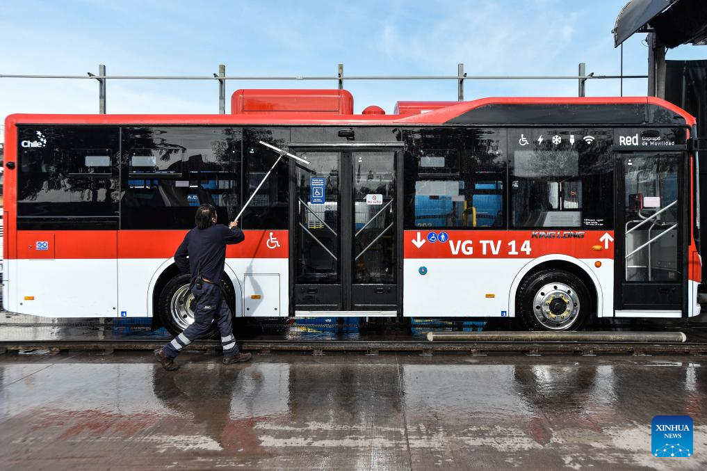SANTIAGO, 7 agosto, 2025 (Xinhua) -- Imagen del 4 de agosto de 2025 de un trabajador limpiando un autobús eléctrico de la marca china, King Long, en la casa matriz de la empresa chilena Vivipra, en la comuna de San Bernardo, en Santiago, capital de Chile. Tienen los mismos altos estándares de los cientos de autobuses que circulan por Santiago de Chile, pero van rumbo a la desértica localidad de Copiapó (norte), que acrecentará su condición de oasis al transformarse en la primera ciudad de Sudamérica en contar con una flota de transporte público 100 por ciento eléctrico, todos de origen chino. (Xinhua/Jorge Villegas)